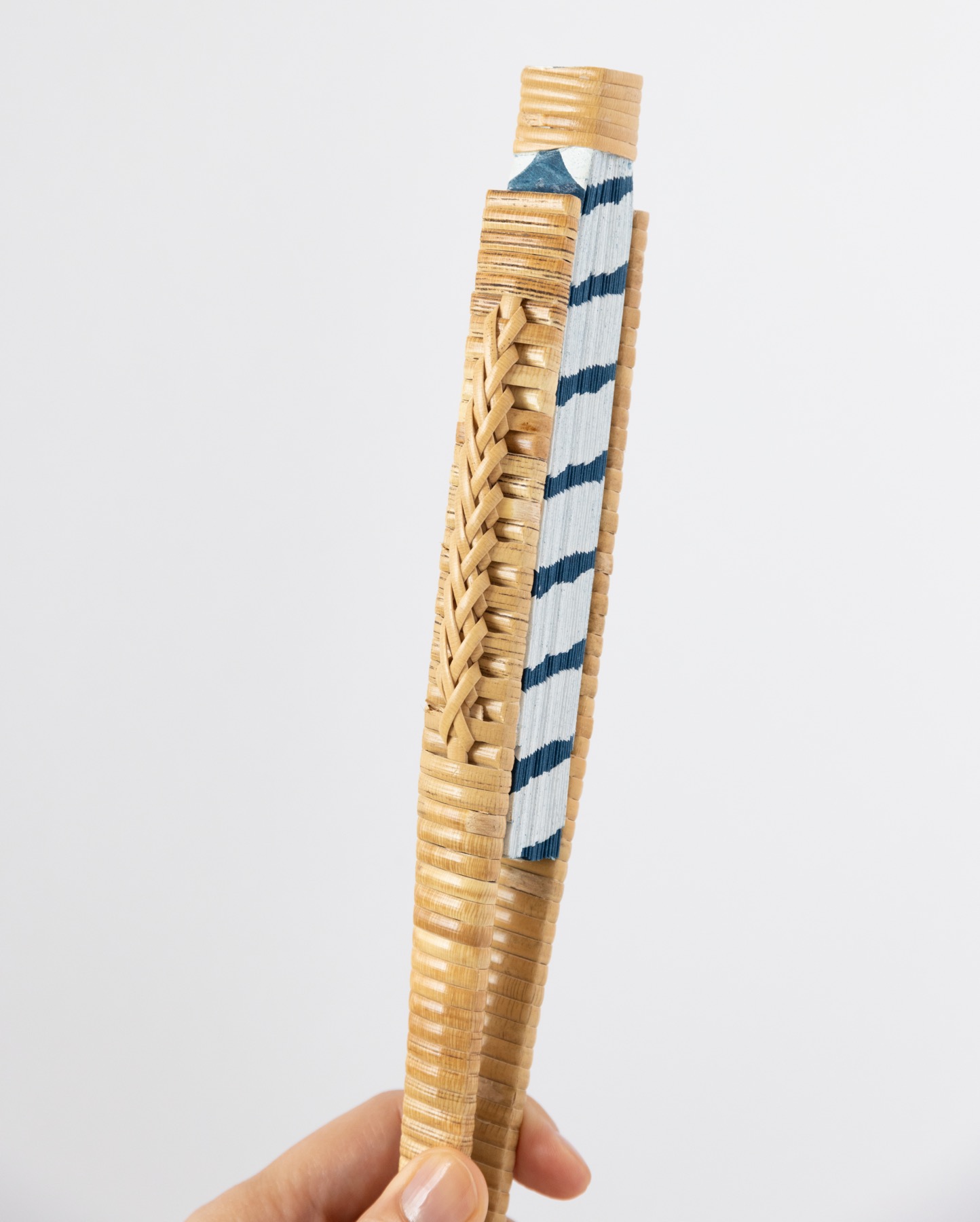 「巻き」「かざり編み」には、ホーロー質の天然のツヤを持った最高級の籐を使用しています。自然のままの籐はヌメ革のように使い込むうちに色が深まり、飴色へ変化していきます。扇を開いているときはもちろん、閉じている時でも籐工芸の美しさを楽しむことができます。