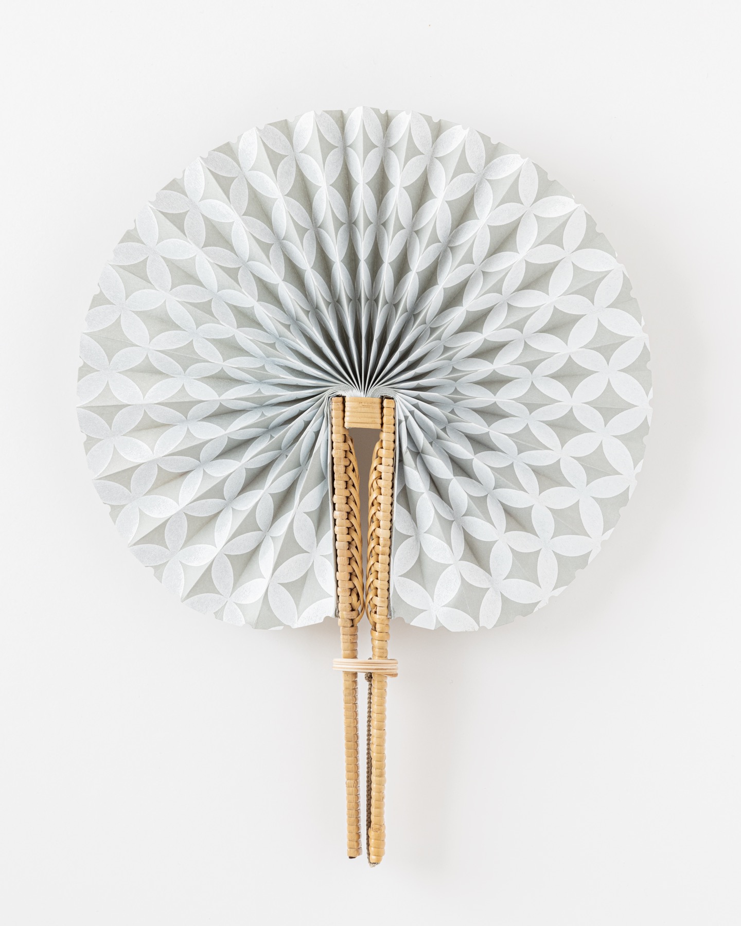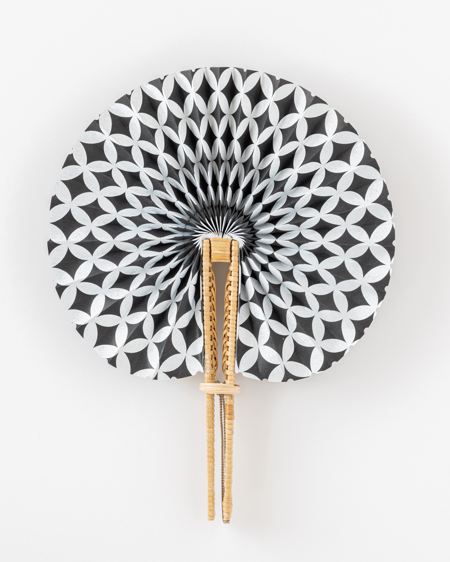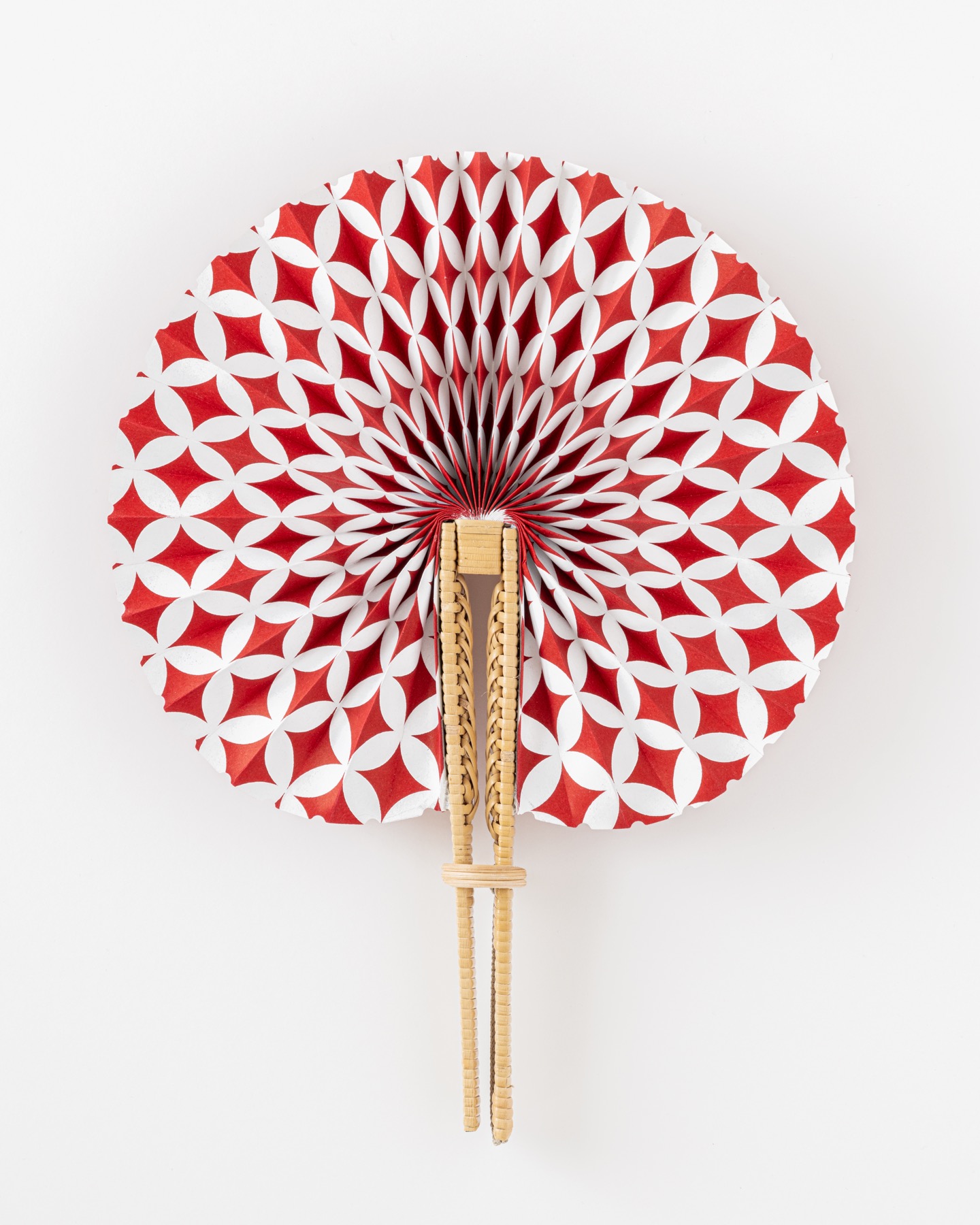 伝統的な籐工芸の技法「巻き」と「かざり編み」を用いた、円形に開く扇子です。